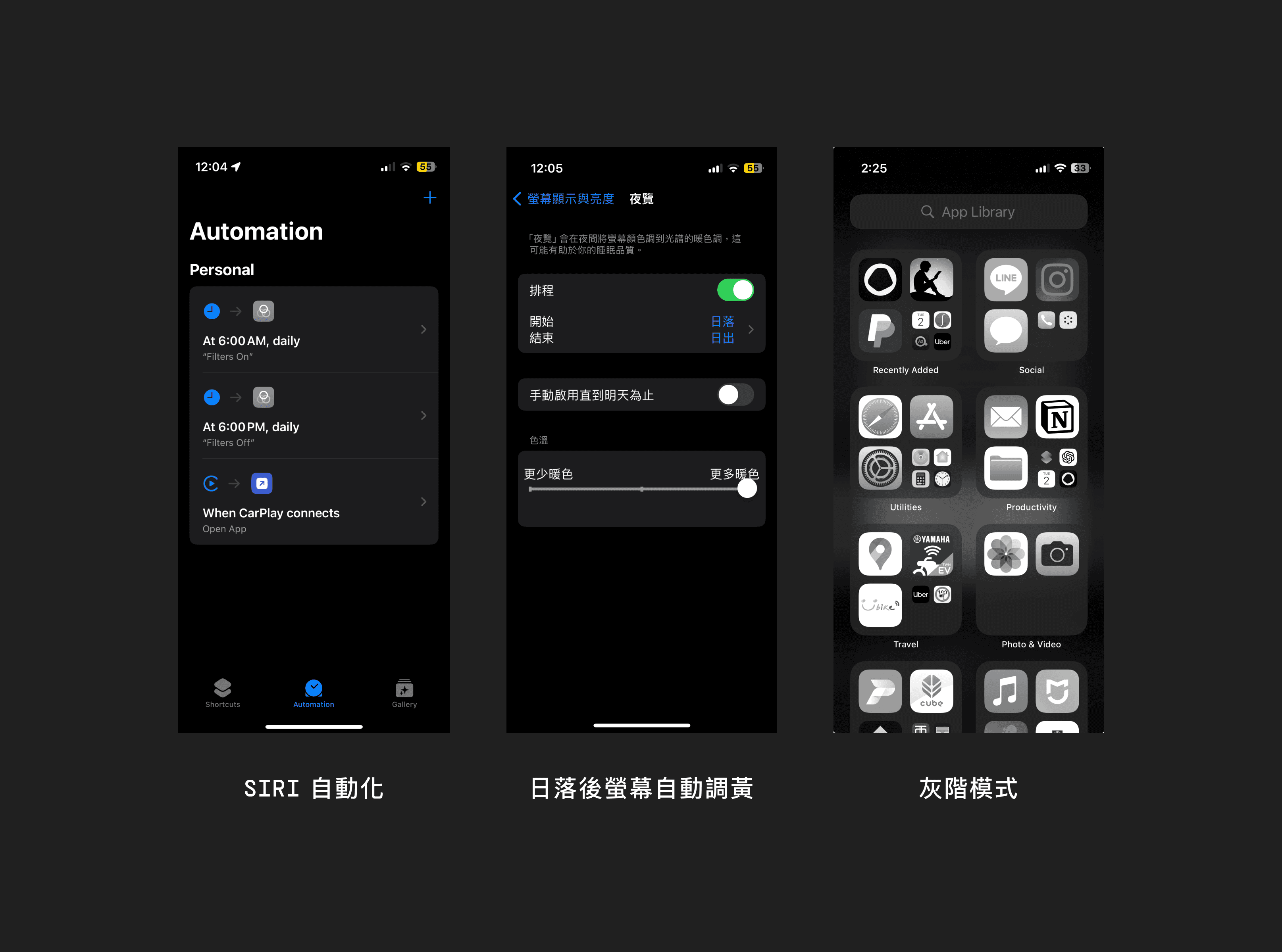 沒有任何通知比你的睡眠還重要了(如果你怕錯過重要的電話,可以選擇開啟勿擾模式就好)自動化灰階模式
