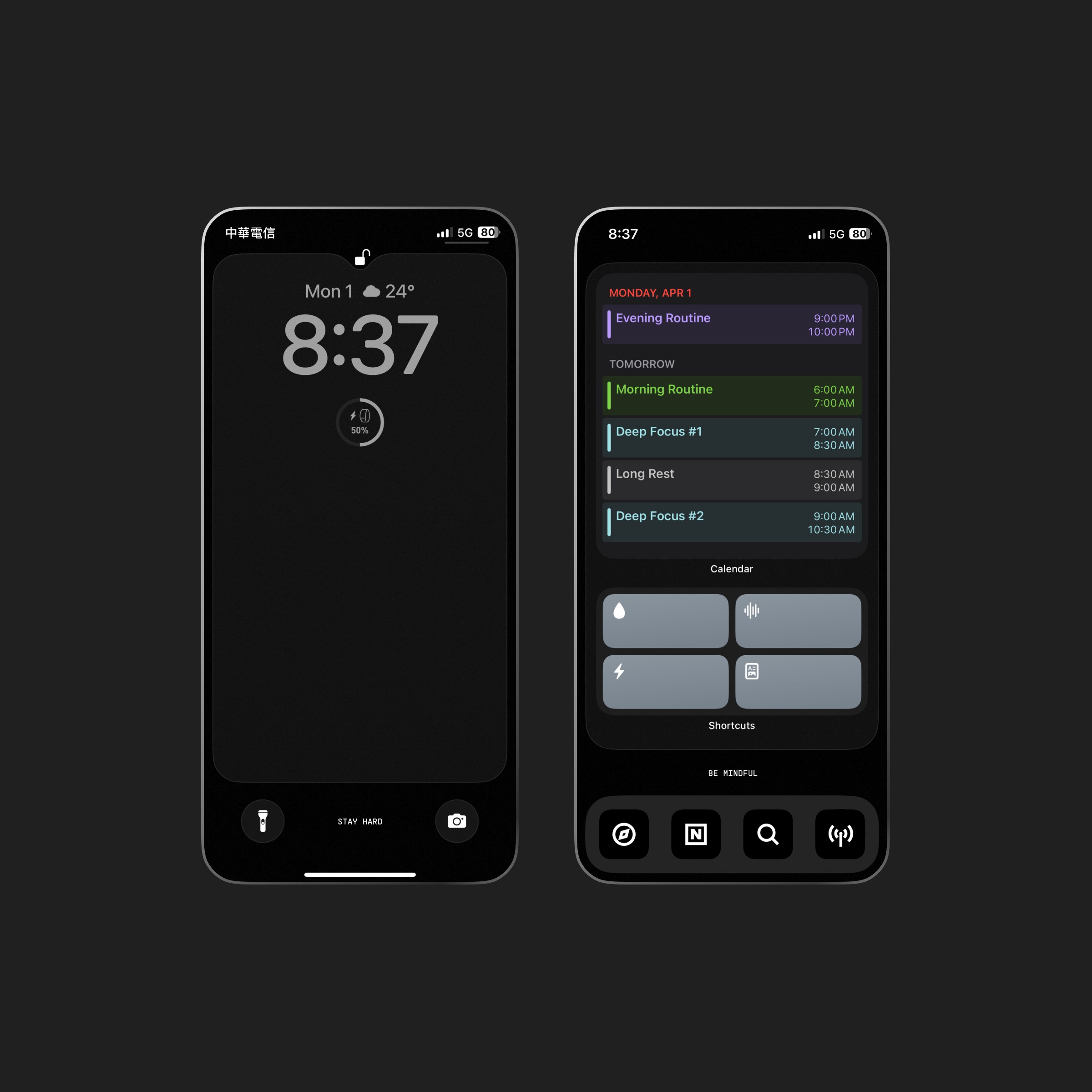 行事曆:隨時查看今日排程,一方面提醒自己現在處在那個時間區塊,同時也避免遺漏掉任何重要的事件Siri 捷徑:這個幾乎可以說是 iPhone 裡最實用的功能之一(多樣性的變化可以取代很多單一功能的 App,也可以設置很多自動化的功能,減少了許多不必要的任務切換)。