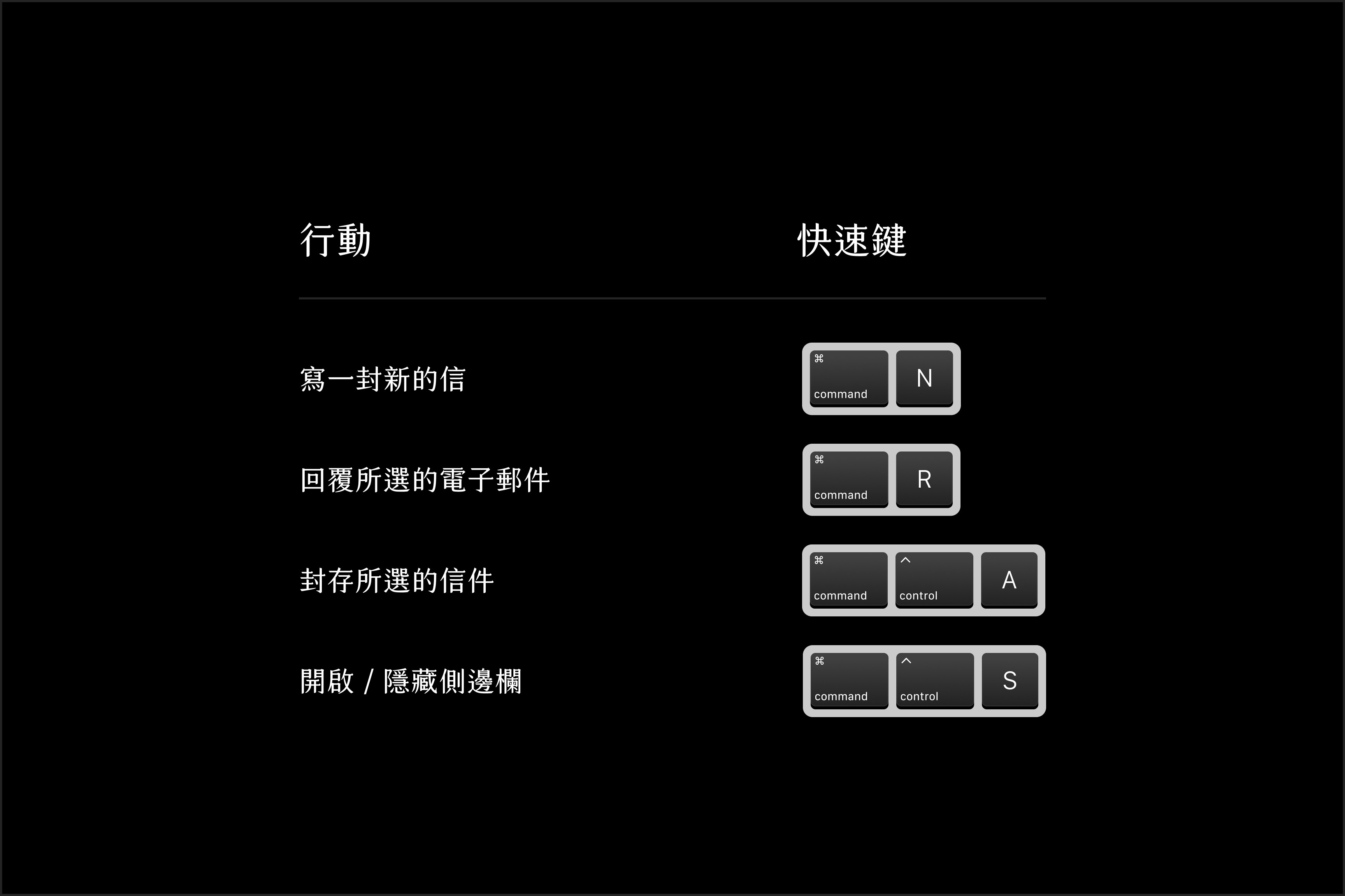 幾個我常用的快速鍵(更多快速鍵可以參考官方連結: Apple、Gmail)