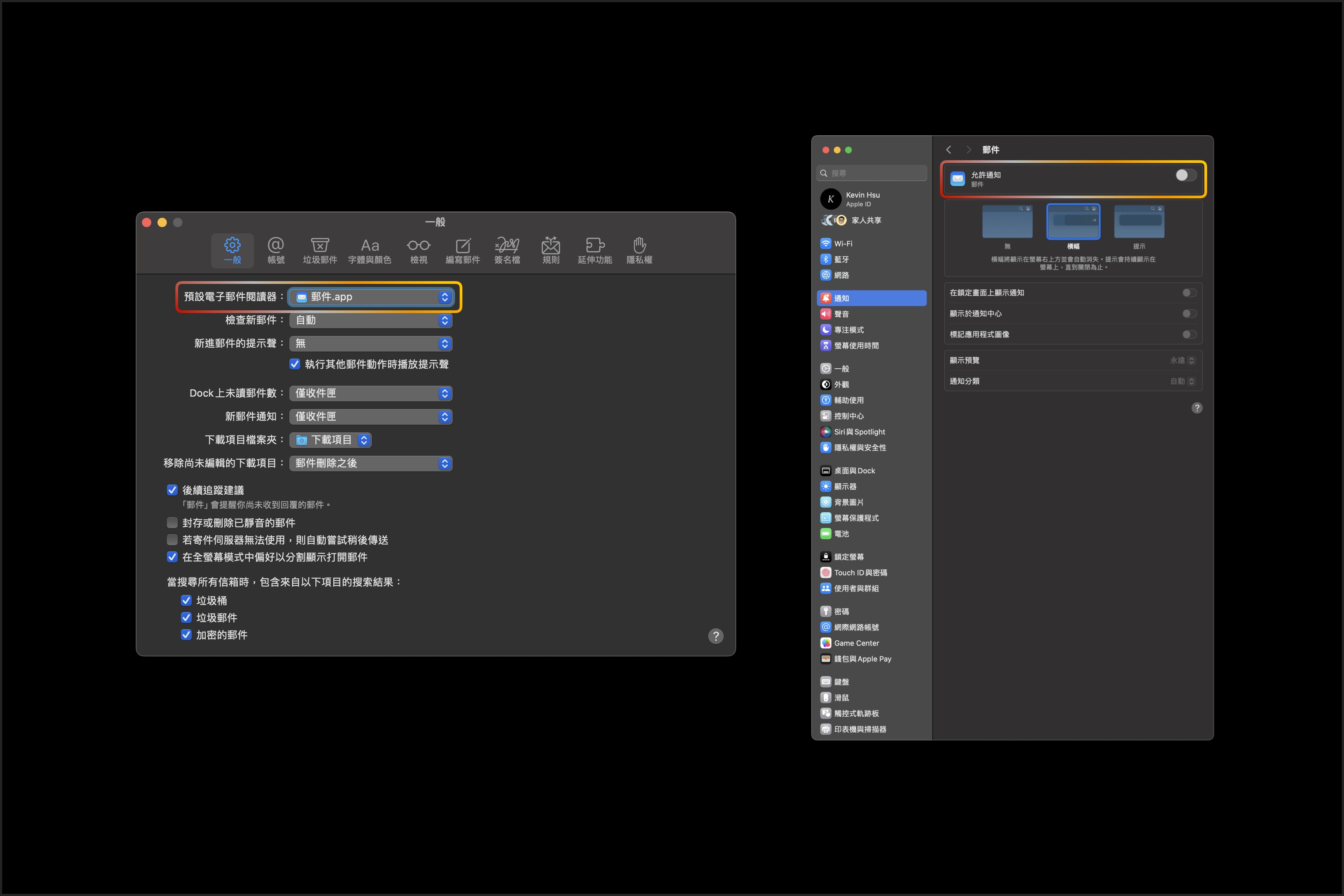 首先,按下「⌘+,」 進入郵件的設定,將「郵件.app」設置為預設的電子郵件閱讀器,然後再到系統設定裡關閉所有通知。