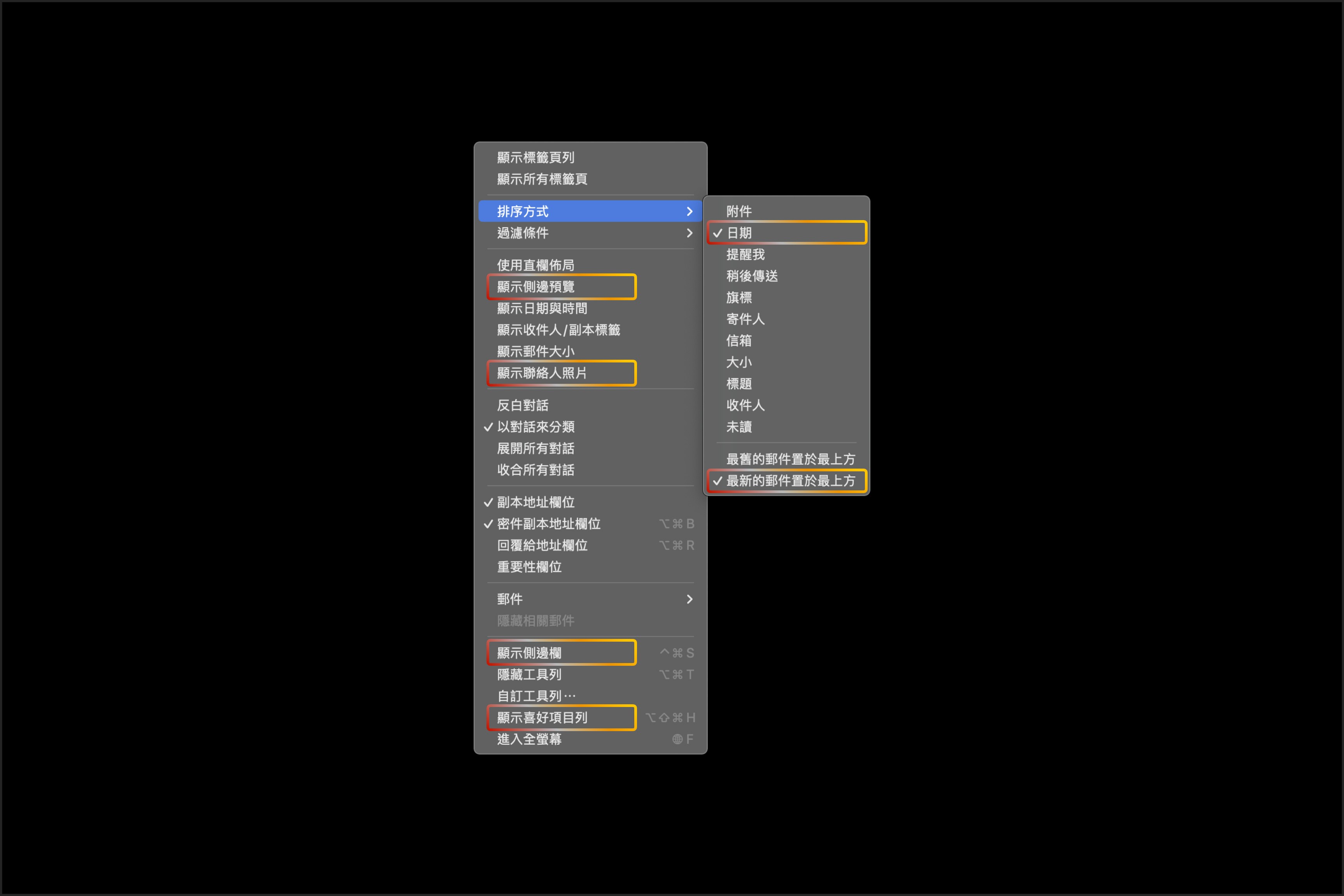 按「日期」排序郵件,並將「最新的郵件置於在最上方」