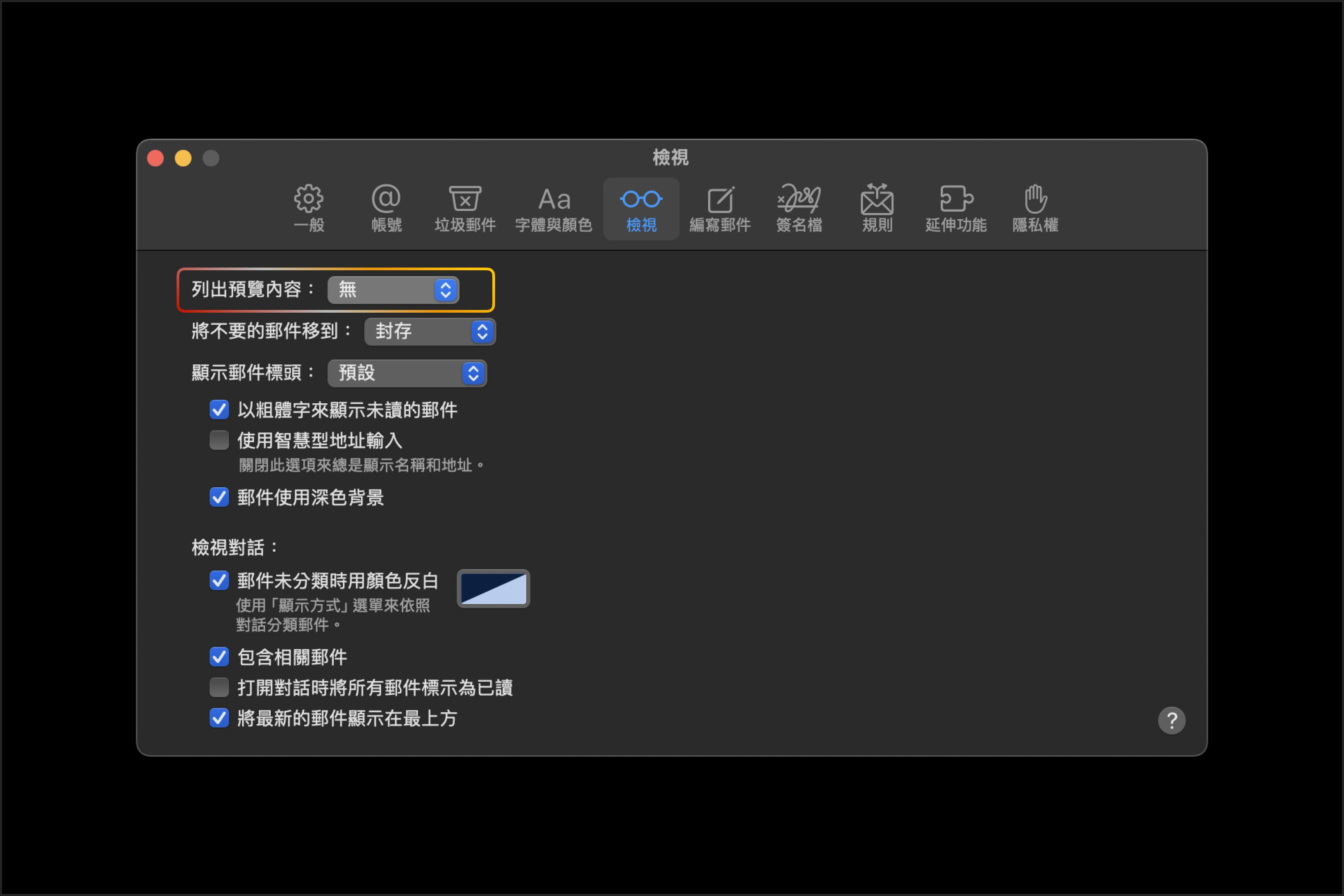 我不需要看到圖片,也不需要預覽郵件內容。大部分的信件只看標題就可以知道要如何處理。如果是必須要處理的信件,再點開看詳細的內容就好。