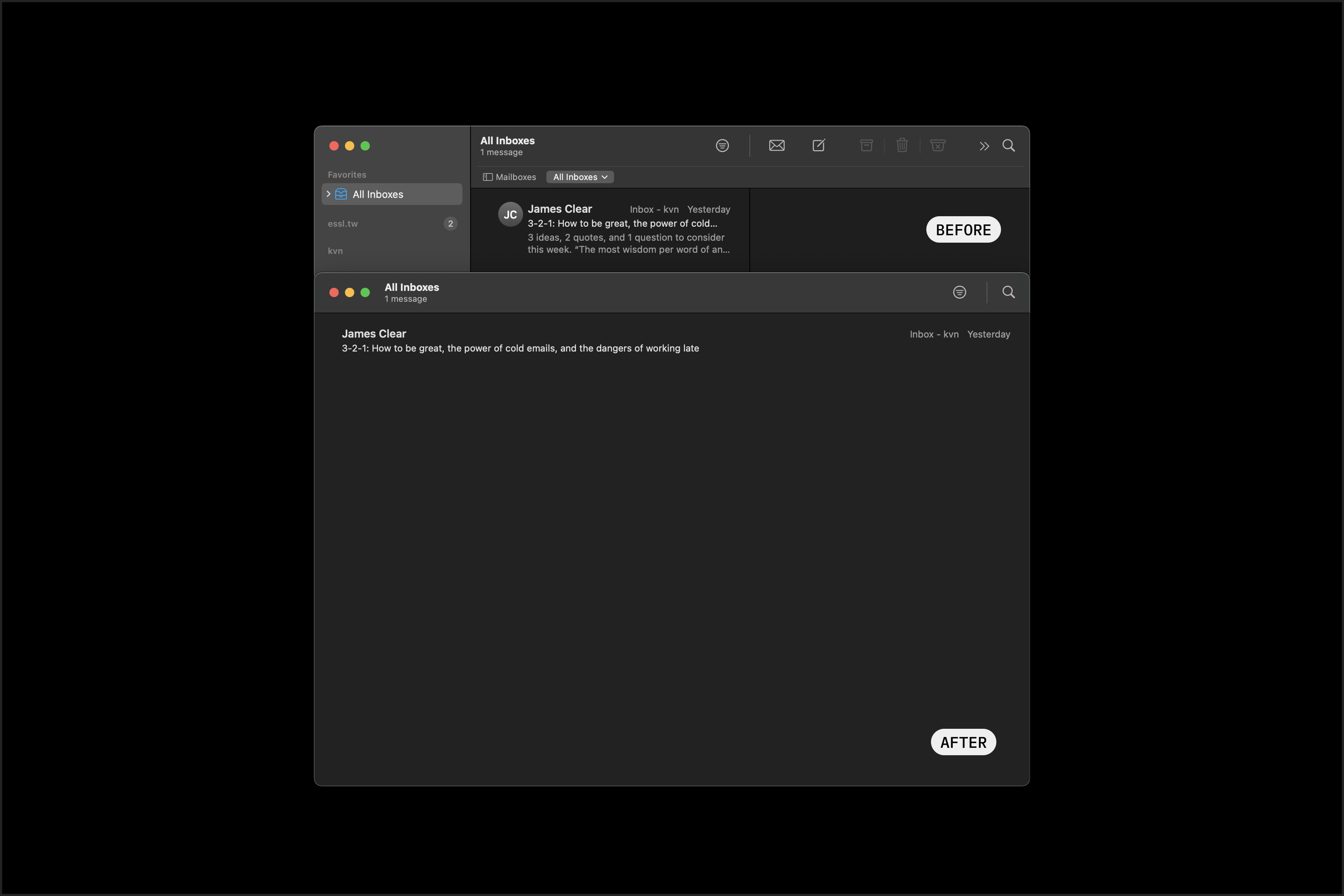以下就是設置前後的差別,介面是不是乾淨許多?當然,你的信件可能不會跟我一樣少。不過別擔心,我會在下面「清理不必要信件」的步驟講解如何整理和刪除這些信件。