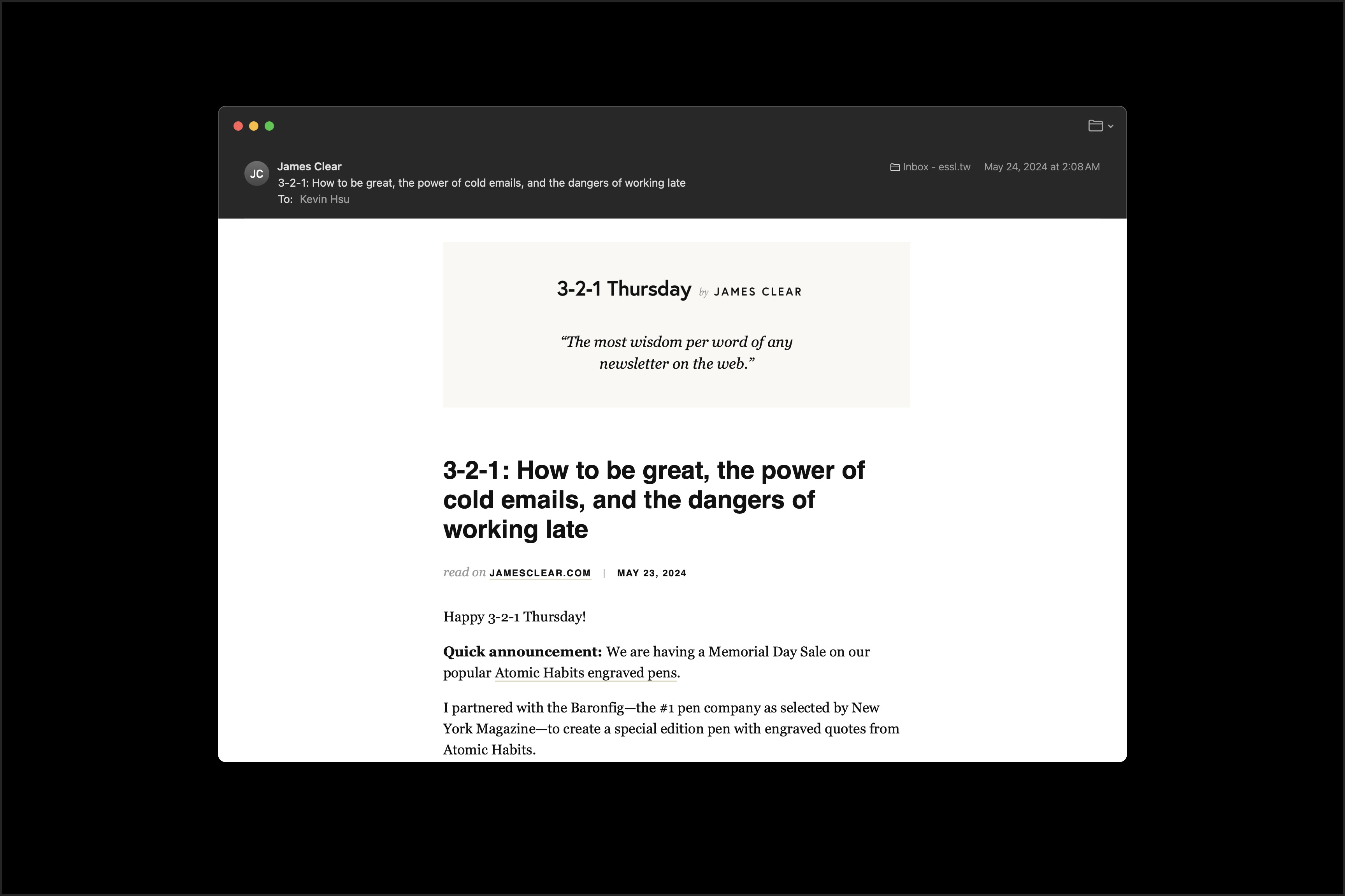 這個時段就是為了確保你回信的內容簡潔扼要、在閱讀重要信件的內容保持專注,並且不會被各種瑣碎的資訊分散注意力。它就像是一個小遊戲,每次把收件箱清空時,都會得到一種小小的成就感。當你習慣之後,這種成就感可是會上癮的!